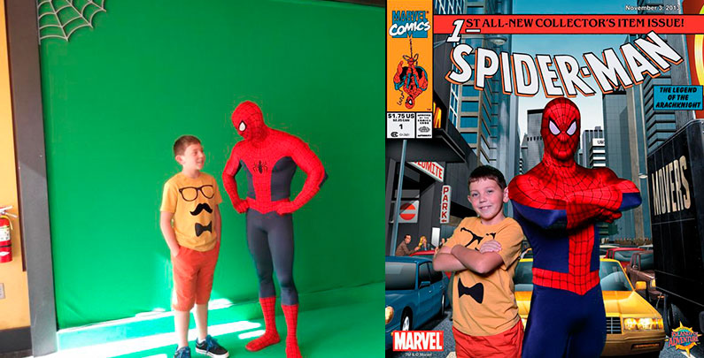 Oportunidades de foto (Photo Op): esse tipo de foto é único da Universal. Essas oportunidades de foto (photo op) estão ligadas a “personagens especiais” que aparecem de forma mais imprevisível no parque (portanto não fazem parte do meet and greet), mas que quando estão por lá representam uma oportunidade incrível de foto. É o caso dos Transformers Photo Op (foto com o Transformer que se mexe e fala) e do Donkey Photo Op (foto com o Burro do Shrek). Outro tipo de oportunidade de foto são fotos produzidas para criar um efeito especial (como a da revistinha do Homem Aranha abaixo).